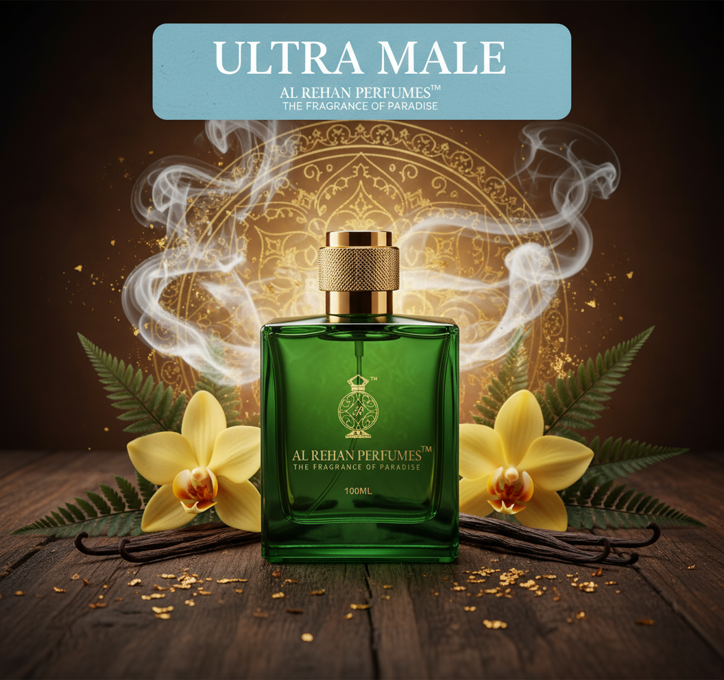 Ultra Male Perfume By Al RehanPerfumes is a Oriental Fougere & Vanilla fragrance for men. Top notes are Pear, Lavender, Mint, Bergamot Lemon and Artemisia; middle notes are Cinnamon, Clary Sage Caraway Lavender Dark Chocolate and Benzoin; base notes are Black Vanilla Husk, Amber, Patchouli Cedar Tonka beans and White Musk.